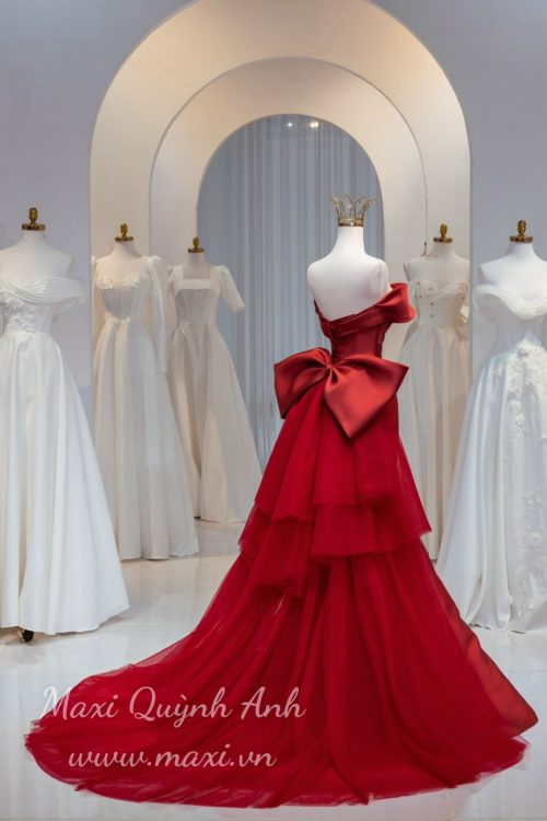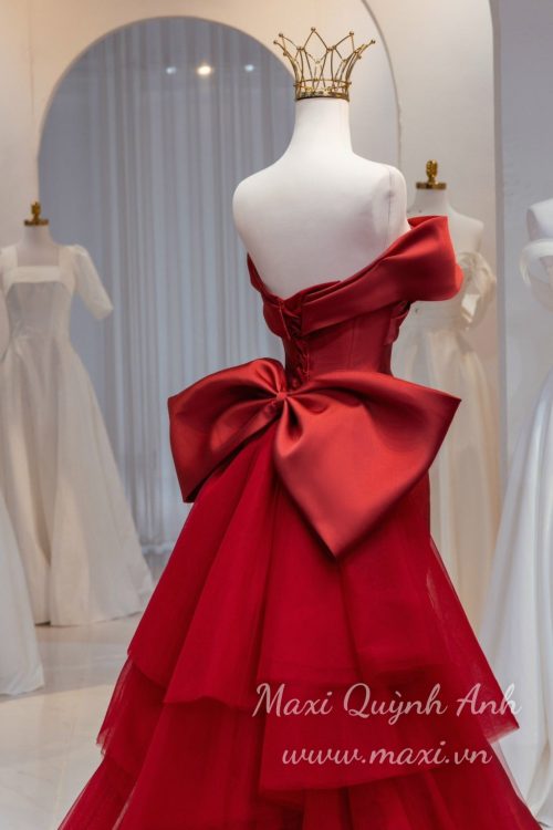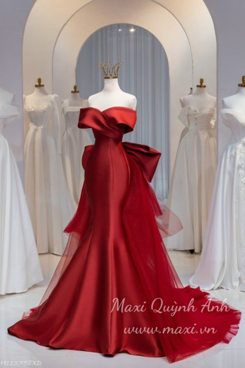 💃 Form dáng đuôi cá ôm sát quyến rũ, giúp tôn lên trọn vẹn đường cong hoàn hảo của cơ thể. Điểm nhấn là thiết kế trễ vai xếp nếp tạo khối 3D độc đáo, khoe khéo bờ vai thon thả và xương quai xanh quyến rũ. Phần lưng được trang trí bằng một chiếc nơ lớn bằng vải tuyn mềm mại, tạo sự phá cách và ấn tượng từ phía sau.