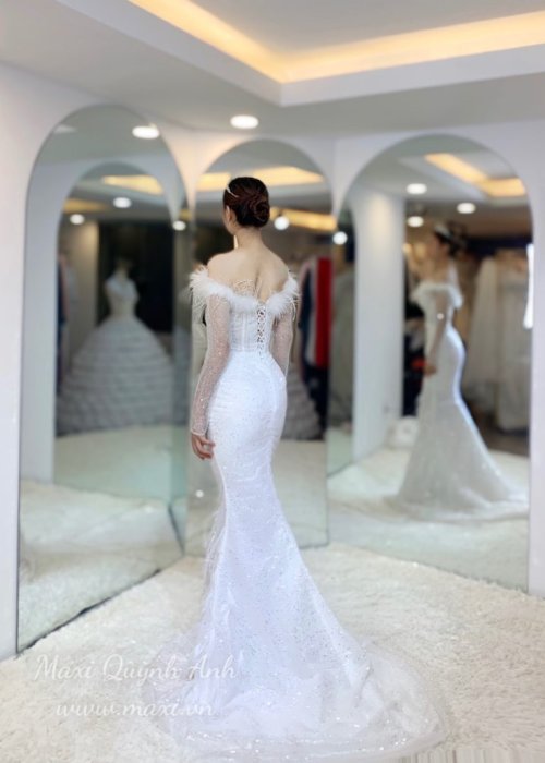 Váy Cưới Body Kim Sa Tay Dài Phối Lông Vũ Ngực