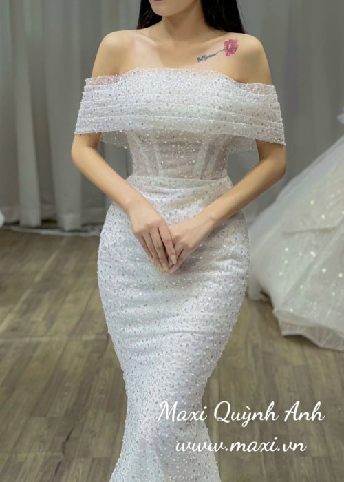 Váy Cưới Body Kim Sa Trễ Vai Sang Trọng