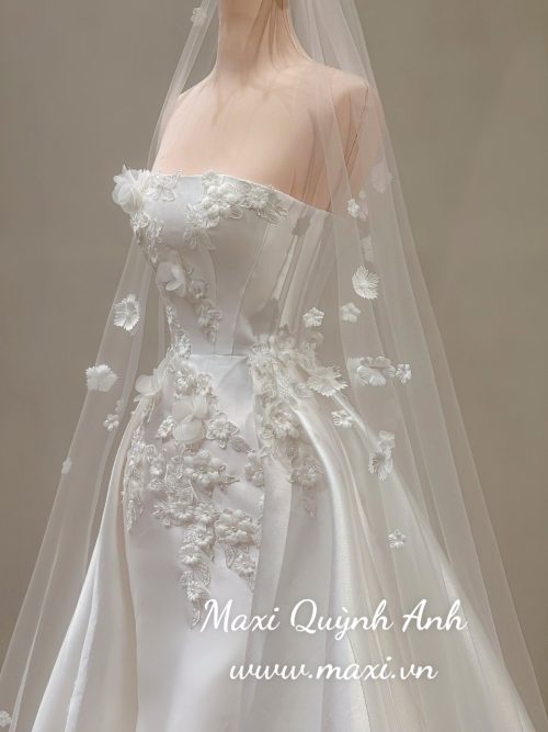 Thiết kế ôm sát giúp nàng dâu khoe trọn vóc dáng yêu kiều, trong khi những cụm hoa nổi được đặt tinh tế trải dọc thân váy và eo tạo điểm nhấn kiêu sa và mềm mại.