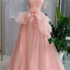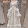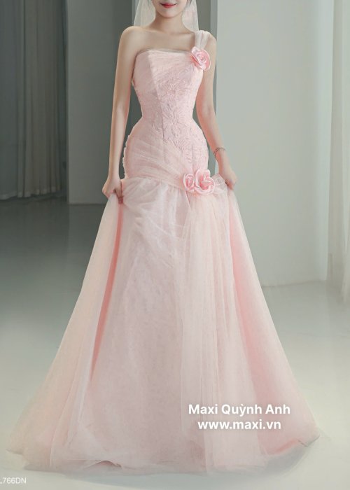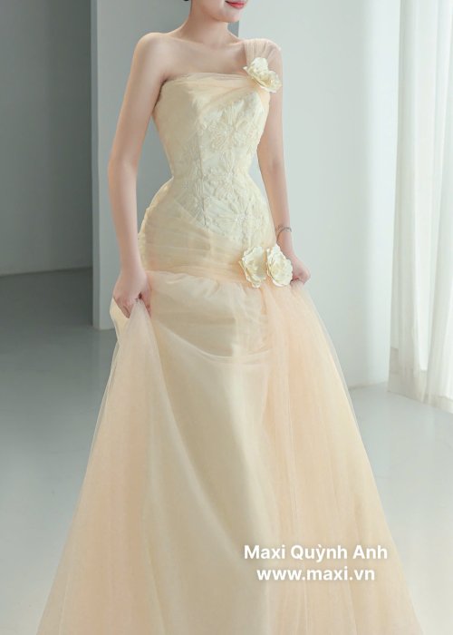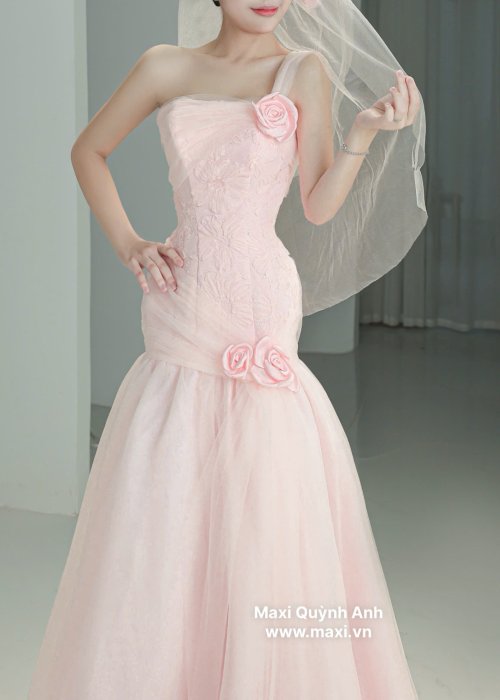 Chiếc váy rất phù hợp cho những cô dâu muốn một chiếc váy cưới phá cách, không quá truyền thống nhưng vẫn giữ được nét lãng mạn và duyên dáng. Váy rất thích hợp cho tiệc cưới ngoài trời hoặc chụp ảnh pre-wedding. Cả hai chiếc váy đều có thiết kế lệch vai (one-shoulder) và phom dáng đuôi cá (mermaid) kết hợp với dáng xòe nhẹ, ôm sát phần thân trên và eo, sau đó xòe dần từ ngang đùi xuống. Với một chi tiết hoa 3D nhỏ được đính ở phần vai, tạo điểm nhấn nhẹ nhàng. Thân trên được may từ chất liệu ren hoặc vải có họa tiết thêu chìm, tạo vẻ tinh tế và gợi cảm. Phần eo cũng được nhấn bằng một bông hoa 3D lớn, tương tự như hoa ở vai, tạo sự hài hòa.