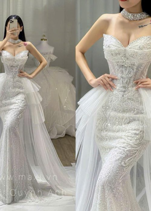 - Vai trễ gợi cảm: Dây vai trễ mềm mại khoe bờ vai thon thả một cách duyên dáng, khiến nàng dâu trông như một nàng thơ bước ra từ khu vườn cổ tích.