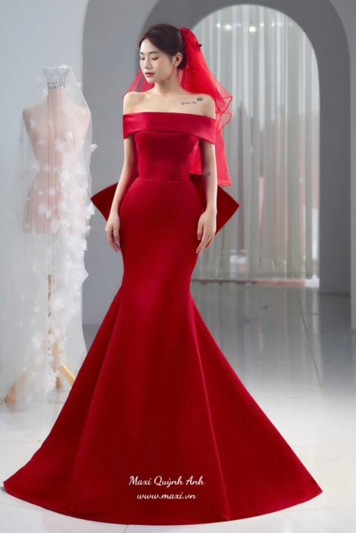 Váy Cưới Body Trễ Vai Đỏ Kèm Nơ Tao Nhã – Vẻ Đẹp Sang Trọng & Quyến Rũ