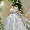 Chiếc váy cưới này là sự kết hợp tinh tế giữa vẻ đẹp hiện đại và nét lãng mạn cổ điển, mang đến cho cô dâu một phong thái kiêu sa và thanh lịch. Váy được thiết kế trên nền vải phi lụa cao cấp với độ bóng mượt tự nhiên, tạo cảm giác mềm mại và sang trọng. Từng đường may tinh xảo ôm trọn vóc dáng, giúp tôn lên những đường cong quyến rũ một cách khéo léo.
