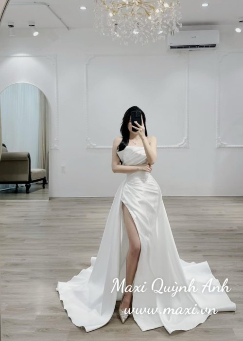 Váy Cưới Body Xếp Ly Ngực Xẻ Tà Tao Nhã