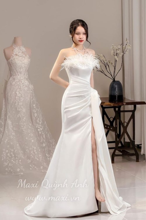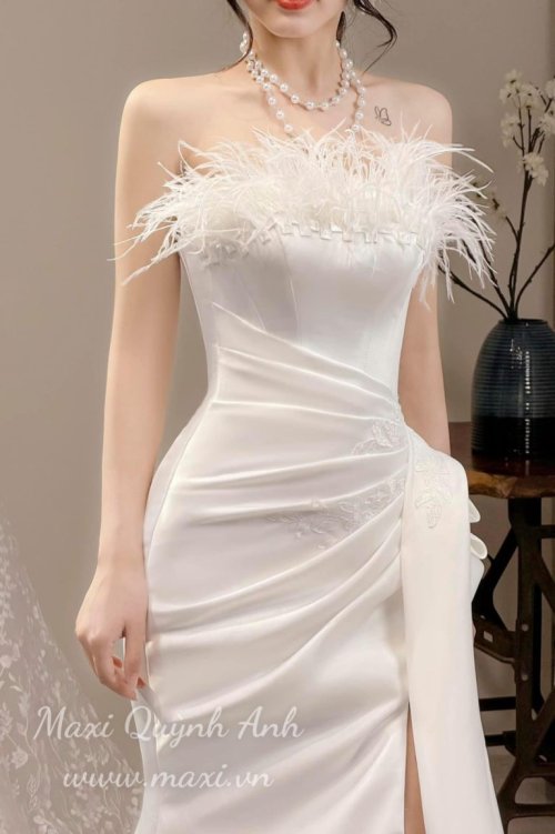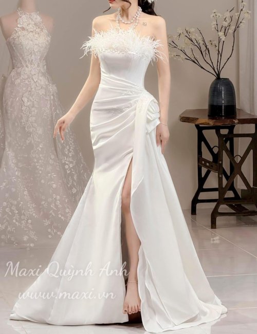 Váy Cưới Body Xếp Ly Xẻ Tà Phối Lông Vũ Ngực Sang Trọng