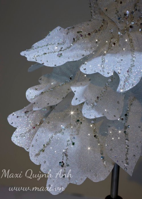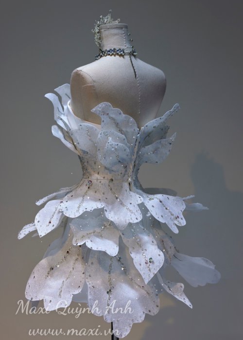Thiết kế váy bồng bềnh như những đám mây, với những cánh hoa 3D mềm mại, tạo nên vẻ đẹp vừa mơ màng vừa bay bổng. Từng cánh hoa được phủ một lớp kim tuyến nhẹ nhàng, lấp lánh như sương mai dưới ánh nắng. Đây không chỉ là một chiếc váy cưới, mà còn là một tác phẩm nghệ thuật, mang đến cho bạn một vẻ đẹp thanh khiết và đầy chất thơ.