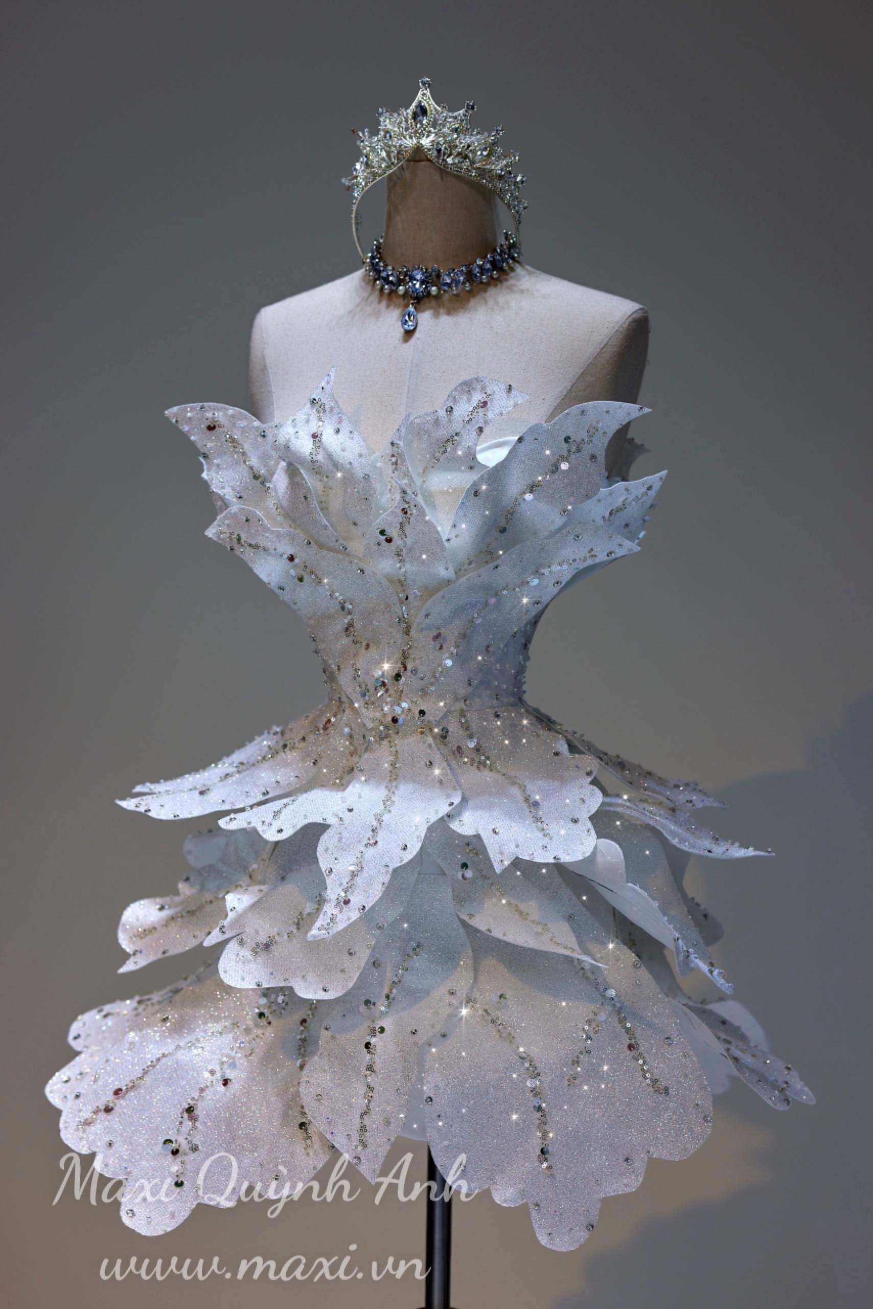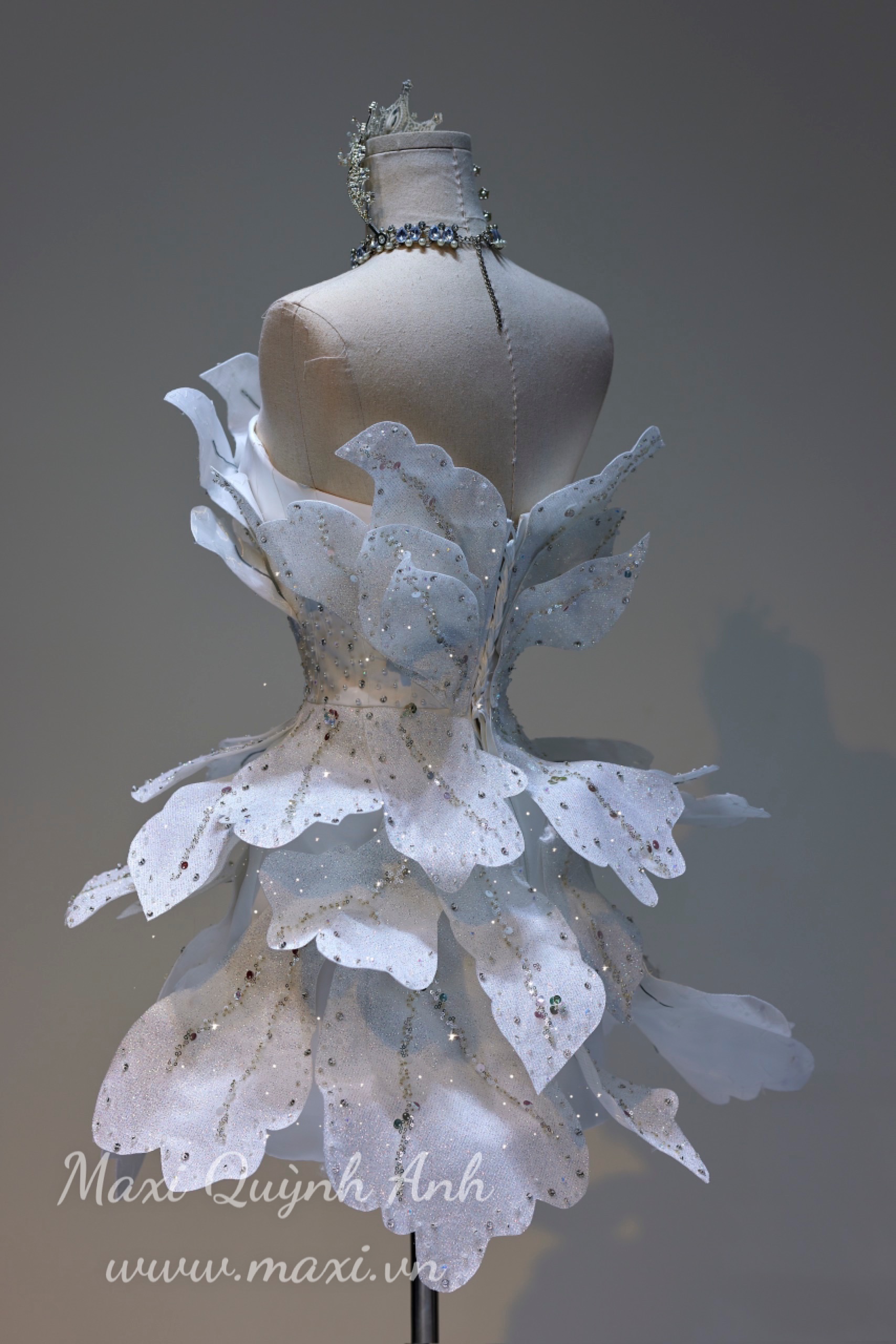 Sự giao thoa hoàn hảo giữa vẻ đẹp của thiên nhiên và sự lấp lánh của những vì sao. Váy cưới được thiết kế cúp ngực quyến rũ, kết hợp với những cánh hoa 3D tinh xảo. Điểm nhấn là những hạt kim tuyến lấp lánh được đính kết tỉ mỉ, giúp cô dâu tỏa sáng rực rỡ trong ngày hạnh phúc.