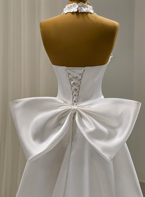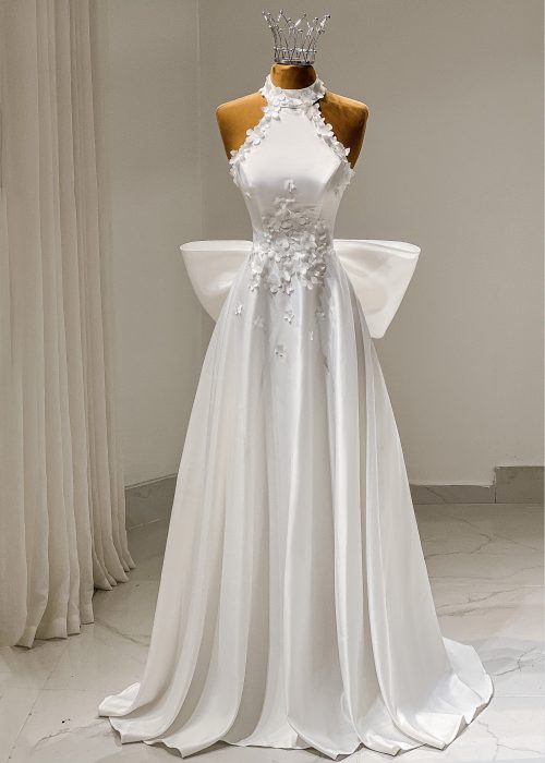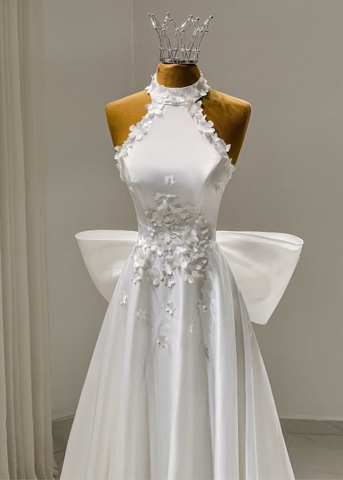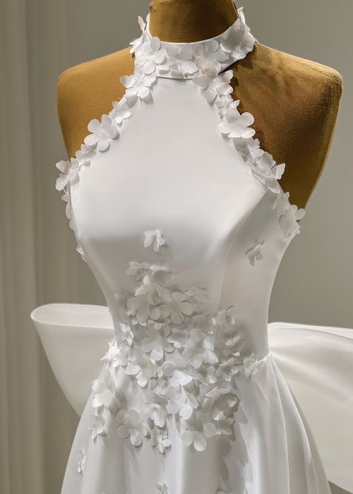Điểm nhấn của chiếc váy là phần cổ yếm đính hoa 3D thủ công tinh tế, trải dài xuống phần ngực. Những cánh hoa nhỏ, bay bổng như đang dạo chơi trên nền vải, làm tăng thêm sự nữ tính và thanh lịch. Phía sau váy, một chiếc nơ bản lớn được tạo dáng đầy ấn tượng, tạo nên sự cân đối và phá cách, khiến cô dâu trở nên nổi bật và lãng mạn hơn bao giờ hết.