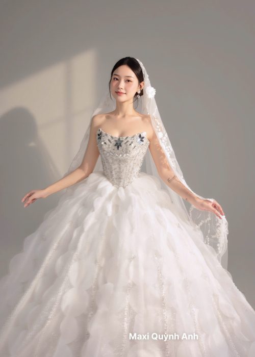 Chiếc váy cưới dáng công chúa bồng bềnh được thiết kế tinh xảo với phần thân trên cúp ngực gợi cảm, đính hoa nổi và hạt pha lê lấp lánh, tạo điểm nhấn sang trọng đầy cuốn hút. Từng lớp vải voan mềm mại xếp tầng uyển chuyển kết hợp ánh nhũ lấp lánh, mang đến hiệu ứng lung linh dưới ánh đèn, giúp cô dâu trở thành tâm điểm trong ngày trọng đại.