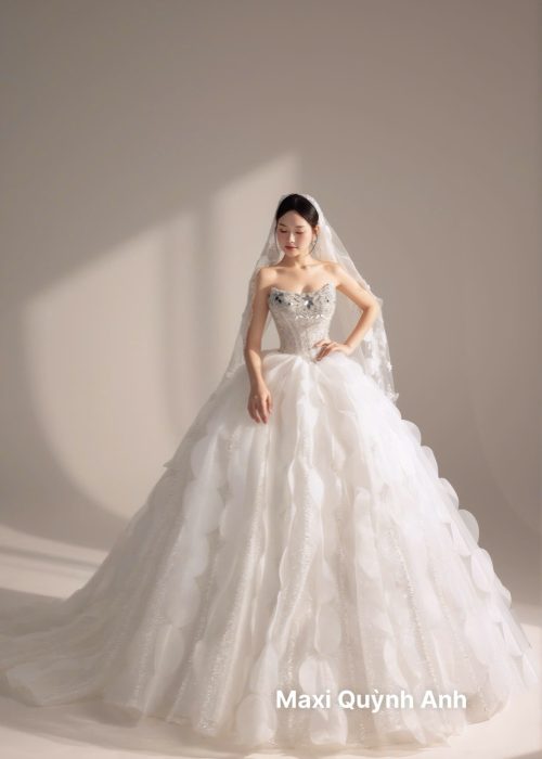 Chiếc váy cưới dáng công chúa bồng bềnh được thiết kế tinh xảo với phần thân trên cúp ngực gợi cảm, đính hoa nổi và hạt pha lê lấp lánh, tạo điểm nhấn sang trọng đầy cuốn hút. Từng lớp vải voan mềm mại xếp tầng uyển chuyển kết hợp ánh nhũ lấp lánh, mang đến hiệu ứng lung linh dưới ánh đèn, giúp cô dâu trở thành tâm điểm trong ngày trọng đại.
