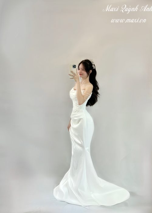 💖 Chất liệu satin bóng cao cấp, trắng tinh khôi, có độ rủ mềm mại và bắt sáng nhẹ nhàng, giúp chiếc váy thêm phần lộng lẫy và sang trọng. Phần đuôi váy xòe nhẹ, tạo sự uyển chuyển và thướt tha cho mỗi bước đi của cô dâu. Sự kết hợp giữa form dáng hiện đại và chi tiết ngọc trai cổ điển tạo nên một tổng thể hài hòa và đầy tinh tế.