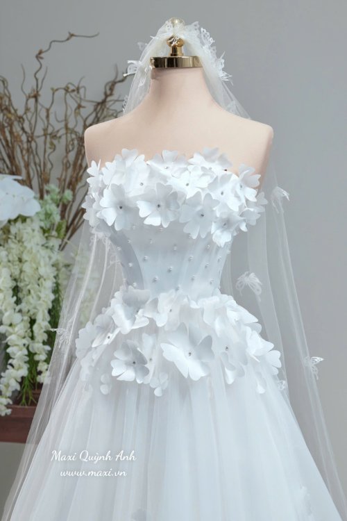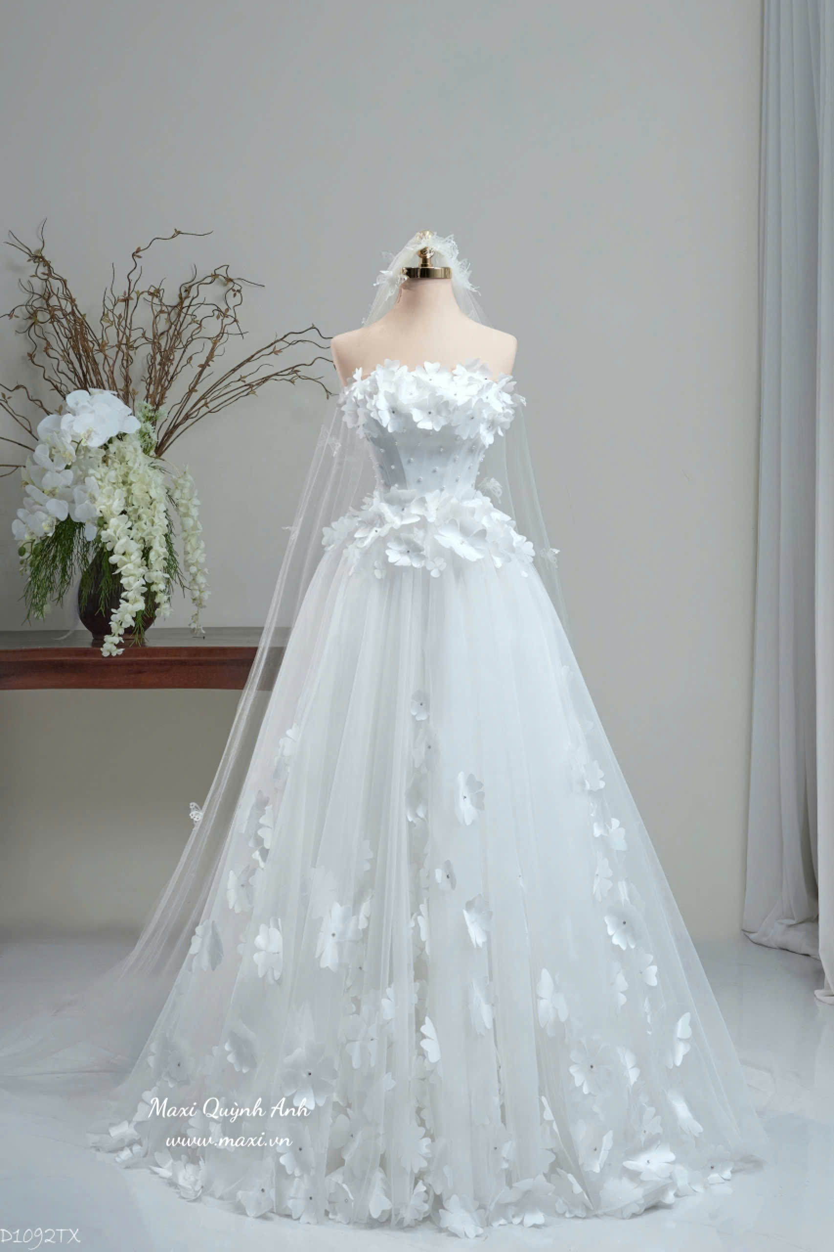 Chiếc váy cưới này là hiện thân của sự nhẹ nhàng, lãng mạn và bay bổng, dành cho cô dâu yêu thích vẻ đẹp tinh khôi như một nàng tiên. 🧚♀️ Thiết kế cúp ngực duyên dáng, với đường viền xếp nếp bồng bềnh tạo cảm giác như những đám mây trắng, tôn lên bờ vai mềm mại. Phần thân corset được đính kết hoa ren tinh xảo, ôm sát eo, giúp cô dâu có một vóc dáng thon gọn. 🦋 Đặc biệt, điểm nhấn độc đáo nhất là những cánh hoa 3D trắng muốt được đính kết thủ công, rải rác từ eo xuống tận chân váy, tạo cảm giác như hàng trăm cánh bướm đang bay lượn. Chân váy xòe bồng bềnh với nhiều lớp voan mỏng cùng dây voan dài mềm mại từ vai, khiến chiếc váy càng thêm phần thướt tha và lộng lẫy. ✨