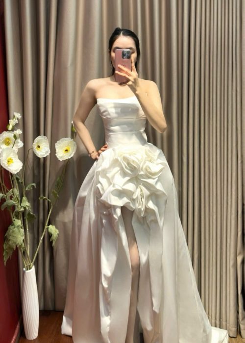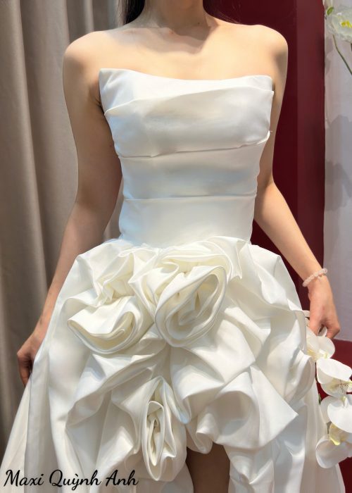 Điểm nhấn nổi bật chính là hoa nổi 3D bản lớn được xếp thủ công ở phần eo trước, mang lại cảm giác mềm mại và tinh tế như những cánh hoa đang nở rộ.