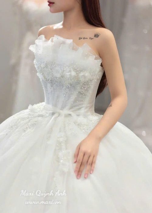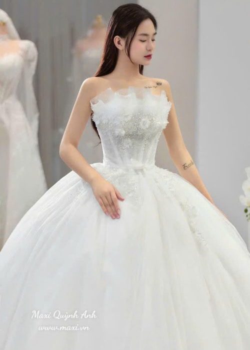 💖 Bước vào lễ đường như một nàng công chúa trong chiếc váy cưới trắng muốt này. Điểm nhấn đầu tiên thu hút mọi ánh nhìn là phần cúp ngực ngang được trang trí bởi những lớp cánh hoa voan mềm mại, tạo hiệu ứng 3D bồng bềnh và quyến rũ. Thân áo ôm sát giúp tôn lên những đường cong tuyệt mỹ của cô dâu. Từ eo trở xuống là chân váy xòe phồng lộng lẫy với nhiều lớp voan mỏng nhẹ, tạo độ bồng bềnh như một đám mây trắng, mang đến vẻ đẹp ngọt ngào và thanh thoát trong ngày trọng đại. ✨