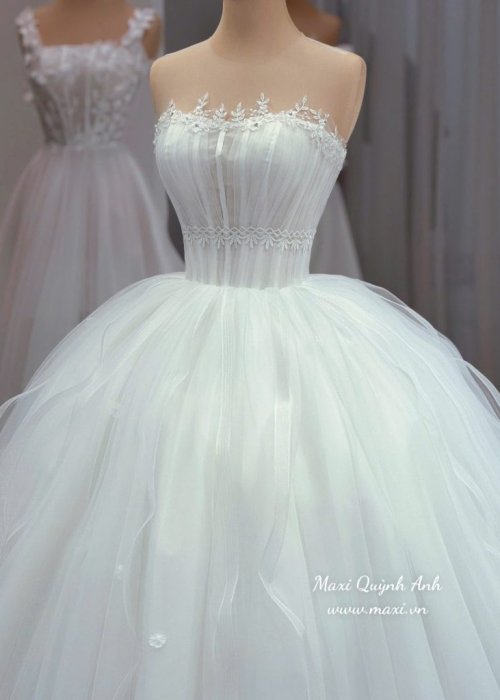 Điểm nhấn nổi bật của chiếc váy là phần tùng váy xòe phồng, được tạo nên từ nhiều lớp vải cao cấp. Với thiết kế tùng to này, cô dâu sẽ có dáng vẻ lộng lẫy và uy nghi, thu hút mọi ánh nhìn khi sải bước. Chiếc váy không chỉ là một trang phục mà còn là một tuyên ngôn về vẻ đẹp sang trọng và lãng mạn.