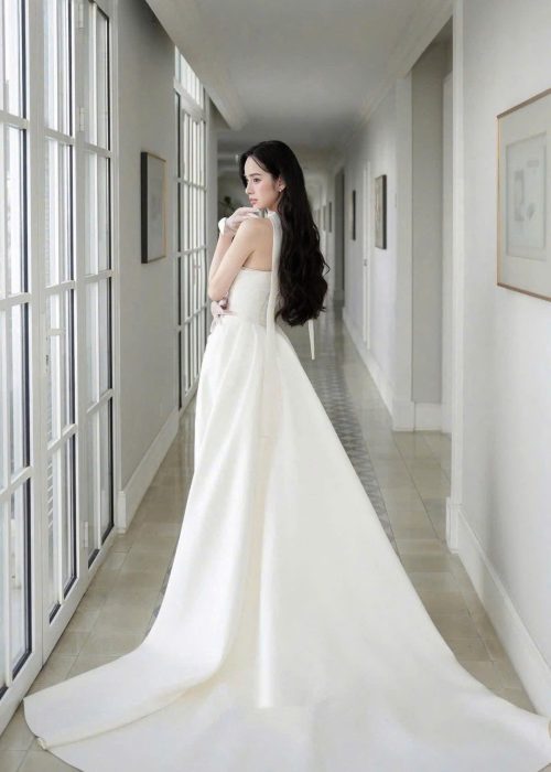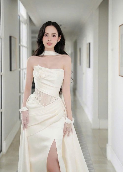 Váy cưới được may từ lụa phi Hàn cao cấp mềm mịn, mang lại độ rủ tự nhiên và sự sang trọng. Thiết kế corset trong suốt tinh tế ôm dáng, kết hợp cùng chi tiết hoa ren thêu tay và hạt ngọc trai đính kết tỉ mỉ ở eo, tạo điểm nhấn đầy quyến rũ. Phần xẻ tà cao kết hợp tà váy dài thướt tha giúp cô dâu vừa gợi cảm vừa thanh lịch.