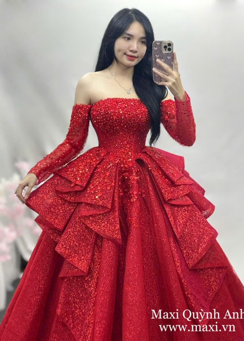 Váy Cưới Đỏ Kim Sa Tay Dài Cao Cấp