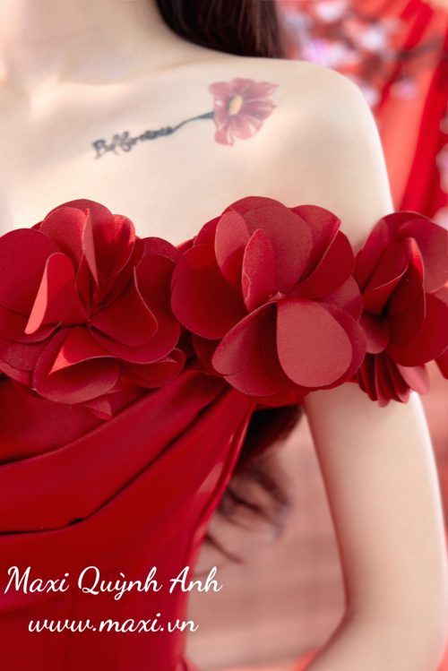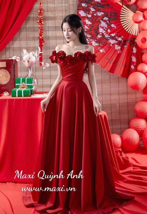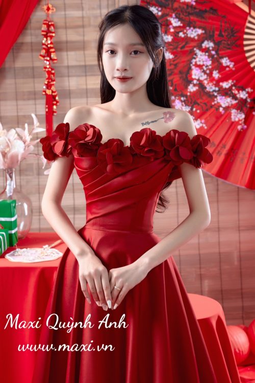 Váy Cưới Đỏ Trễ Vai Bèo Hoa