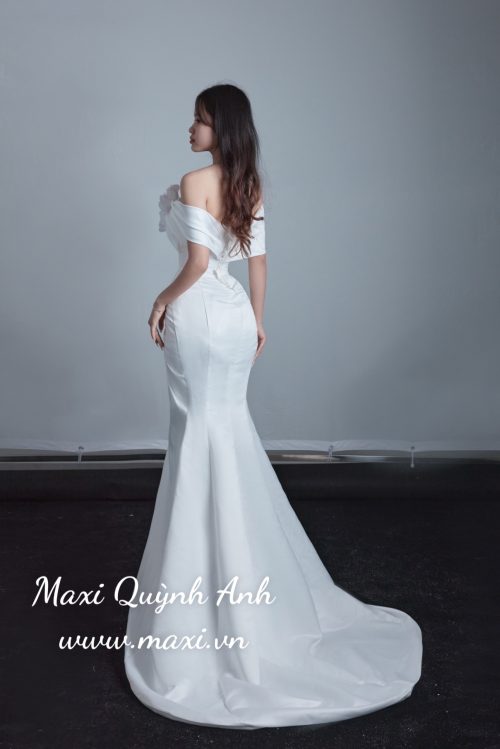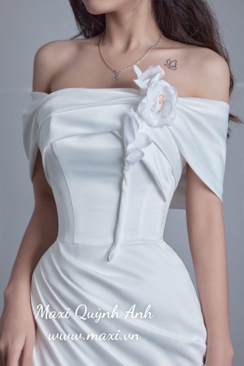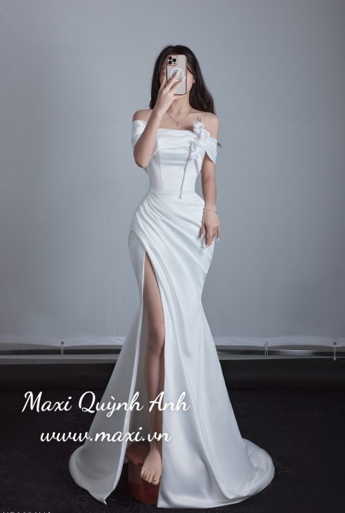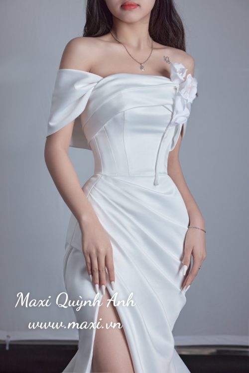 👗 Phong cách: Thiết kế trễ vai hiện đại kết hợp xẻ tà cao đầy gợi cảm, mang lại vẻ đẹp quyến rũ, tự tin và cá tính cho cô dâu.