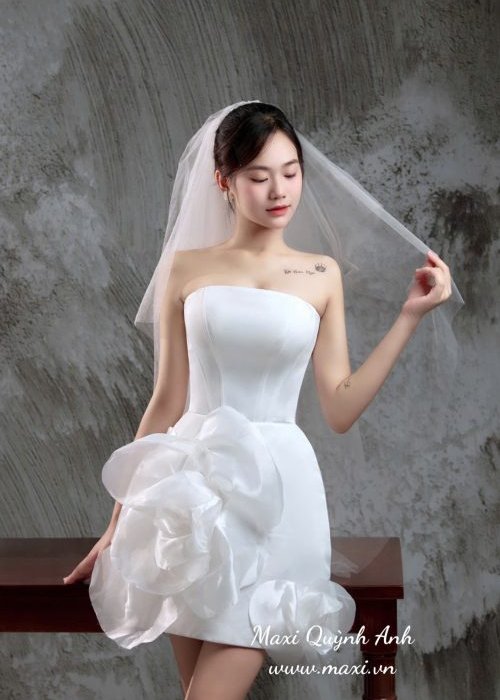 Phần chân váy ngắn được tạo điểm nhấn bằng những lớp vải bồng bềnh, xếp nếp lớn, tạo hình như những cánh hoa hoặc bèo nhún 3D. Điều này mang lại sự độc đáo và ấn tượng cho chiếc váy. Váy có vẻ được làm từ chất liệu vải cứng cáp, có độ đứng phom tốt, giúp giữ được nếp xếp và hình dáng của váy. Cô dâu có thể đi kèm một chiếc khăn voan ngắn, đơn giản, kết hợp hài hòa với phong cách váy.