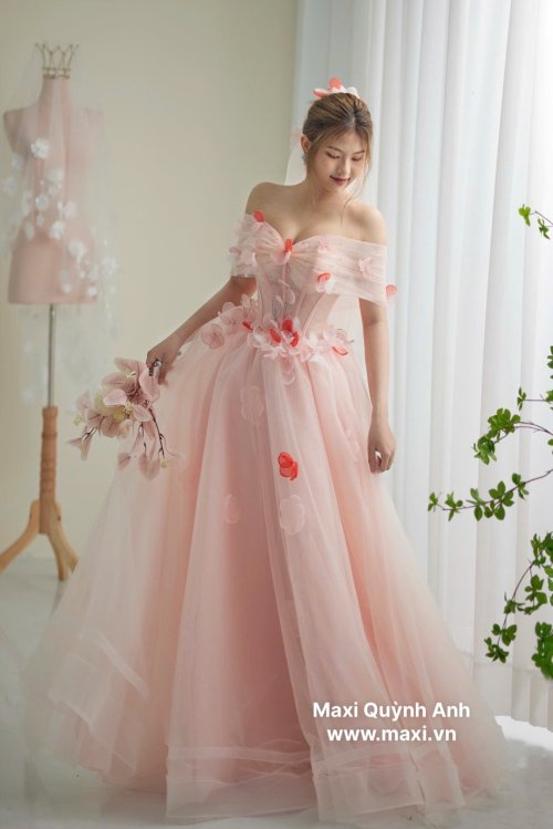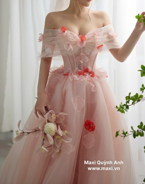 Chiếc váy có màu hồng pastel nhẹ nhàng, ngọt ngào, tạo cảm giác lãng mạn và bay bổng. Đây là màu sắc thường được ưa chuộng cho các cô dâu yêu thích sự nữ tính. Dáng trễ vai (off-shoulder) với những nếp xếp ly hoặc bèo nhún bồng bềnh, mềm mại, giúp khoe khéo bờ vai thon. Phần ngực được điểm nhấn là các chi tiết xếp nơ hoặc cánh hoa 3D tinh tế, tạo sự mới lạ và thu hút. Họa tiết cánh hoa 3D nổi bật, các cánh hoa 3D được đính kết ngẫu nhiên, mềm mại từ phần eo xuống tùng váy. Những cánh hoa này có màu sắc tương phản (như hồng đậm hoặc đỏ) trên nền váy hồng nhạt, tạo điểm nhấn sống động và cuốn hút.