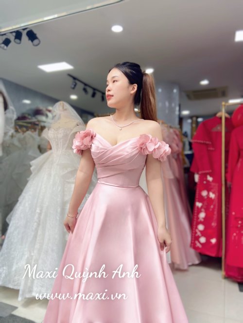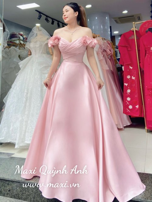 Váy Cưới Hồng Trễ Vai Xếp Ly Ngực (TVHH2200)