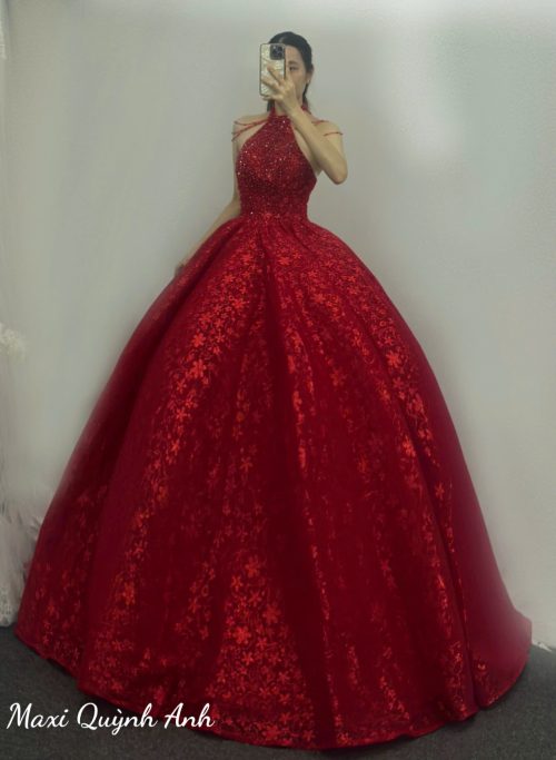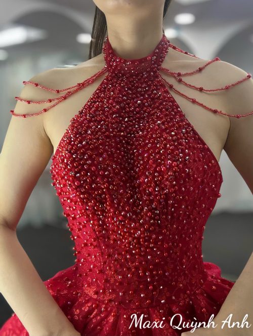 Khoác lên mình váy cưới đỏ đính ngọc trai, nàng dâu trở nên kiêu sa – quyền lực – rực rỡ như một nữ hoàng trong ngày trọng đại. Sắc đỏ nồng nàn tượng trưng cho hạnh phúc viên mãn và tình yêu vĩnh cửu, khiến cô dâu trở thành tâm điểm trong mọi ánh nhìn.