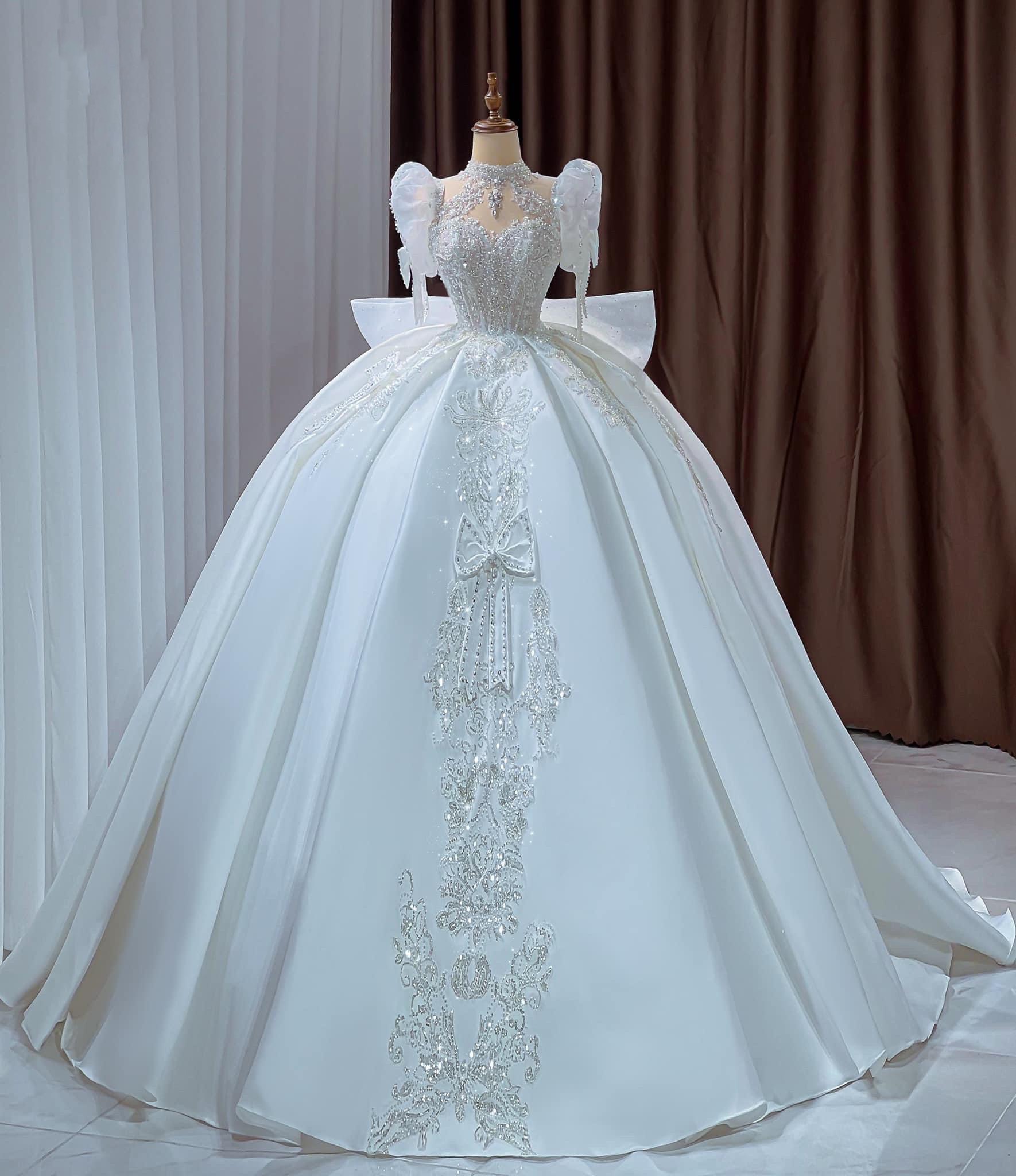 LỘNG LẪY TỰA NỮ HOÀNG VỚI VÁY CƯỚI CỔ CAO KẾT NGỌC KIM SA