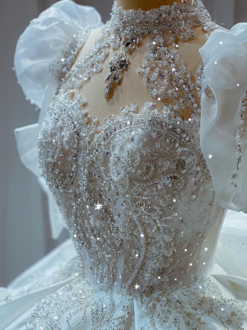 Chiếc váy cưới mang dáng dấp cổ tích với thiết kế cổ cao quý phái, ôm gọn thân trên và xòe bồng kiêu sa. Thân váy được đính kết thủ công hàng nghìn hạt kim sa, pha lê và ngọc trai li ti, tạo hiệu ứng lấp lánh như bầu trời đầy sao.