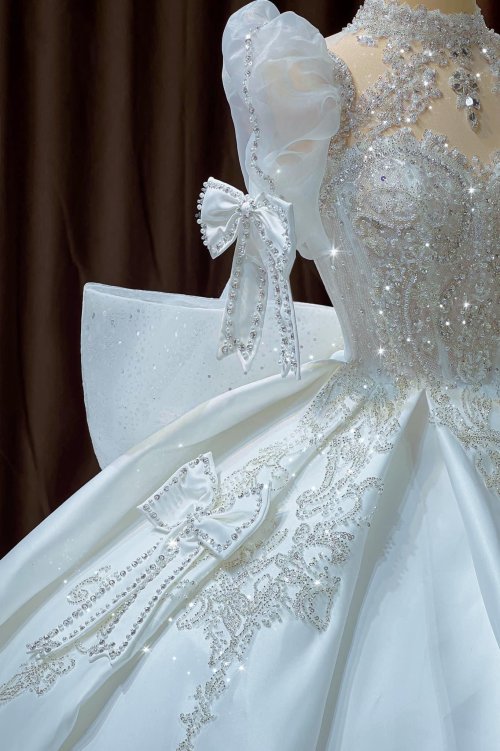 Điểm nhấn nổi bật là những dải ren ánh bạc chạy dọc thân váy, kết hợp nơ 3D tinh xảo trên vai và eo, mang lại nét ngọt ngào nhưng vẫn sang trọng. Tay bồng voan mềm mại, phối cùng tùng váy satin dày dặn giúp dáng váy đứng form hoàn hảo.