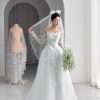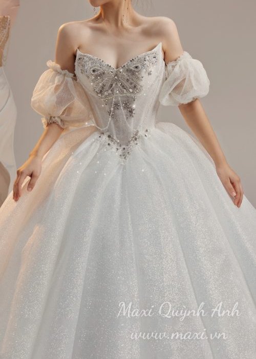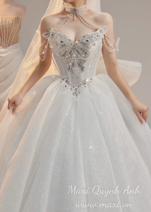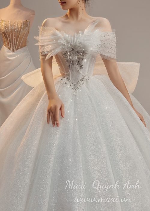 Đây là một mẫu váy cưới trắng tinh khôi, dáng xòe phồng công chúa lộng lẫy, có thể biến tấu nhiều kiểu khác nhau. Váy được làm từ chất liệu vải tulle/lưới kim tuyến lấp lánh, tạo hiệu ứng tỏa sáng huyền ảo. Phần thân trên được thiết kế corset ôm sát, đính kết các hạt đá, pha lê và cườm tinh xảo, tạo điểm nhấn nổi bật. Sản phẩm có thể thay đổi phụ liệu ở phần tay áo và vai: từ kiểu trễ vai quyến rũ, kiểu cổ yếm sang trọng, đến tay phồng lãng mạn, hoặc chi tiết lông vũ mềm mại. Sự đa dạng này giúp cô dâu dễ dàng thay đổi phong cách mà vẫn giữ được nét lộng lẫy, kiêu sa.