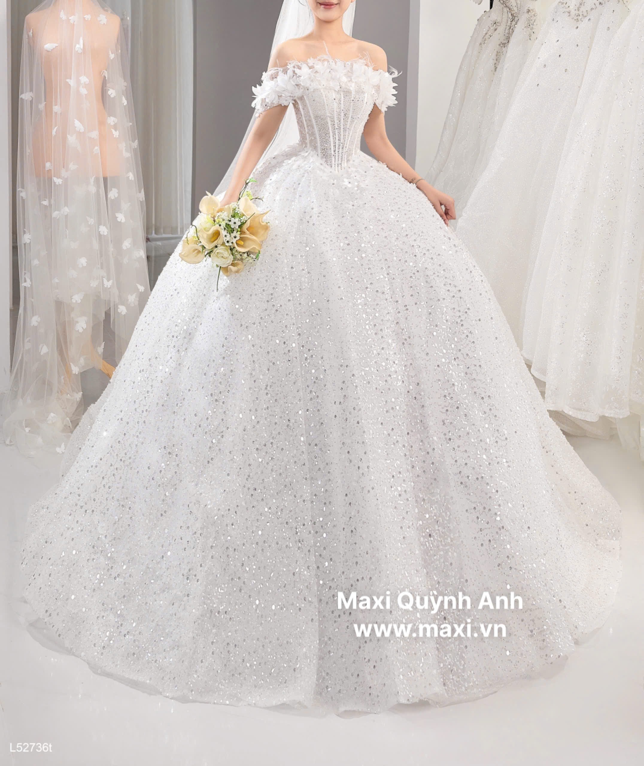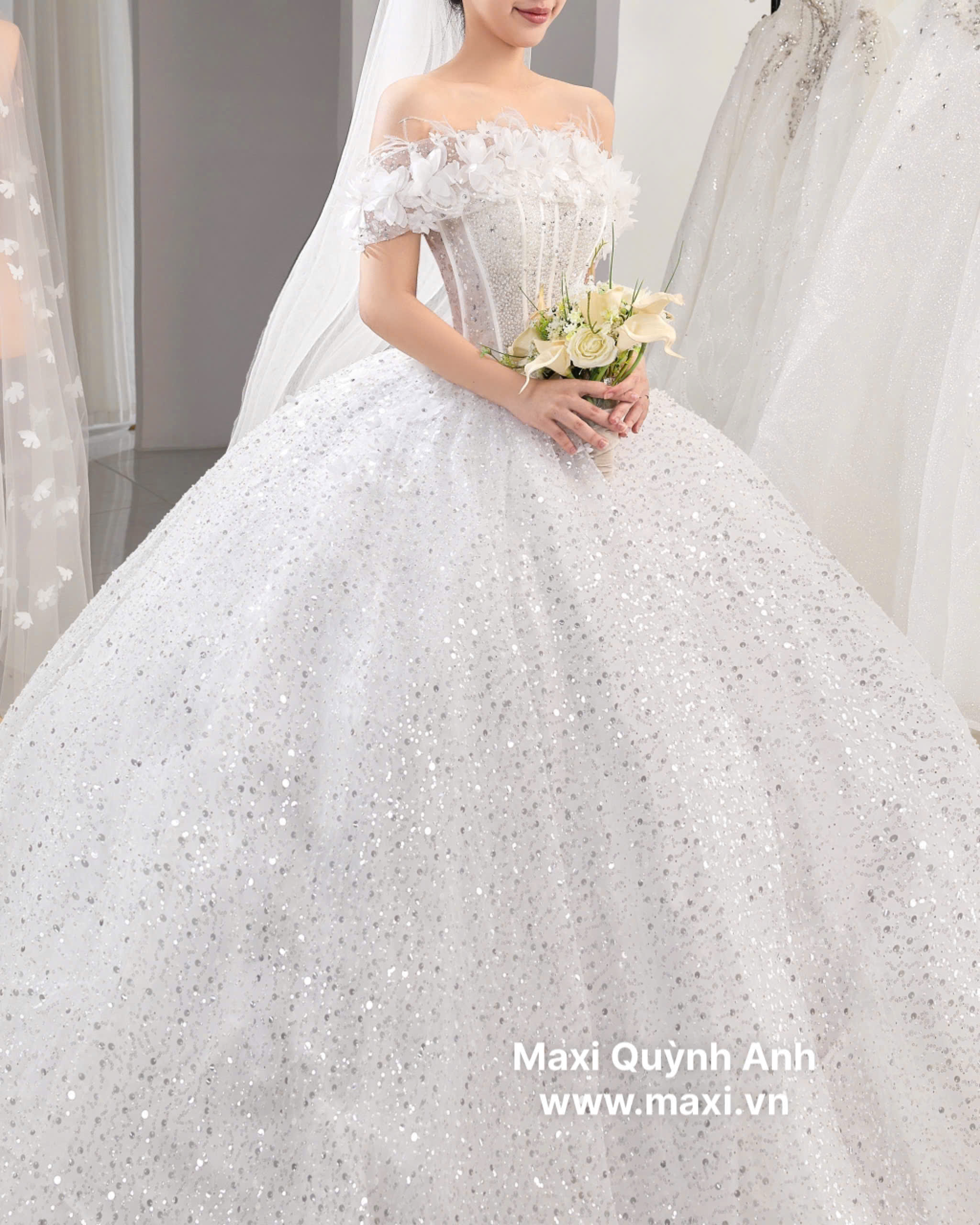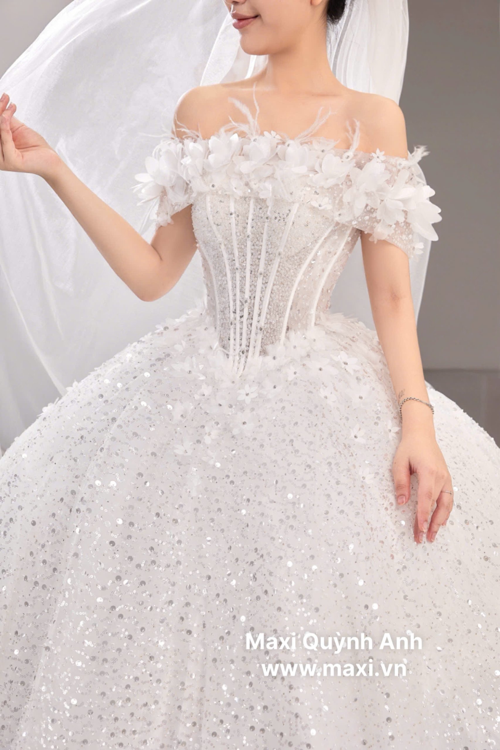 Váy Cưới Kim Sa Phối Trễ Vai Hoa Cao Cấp