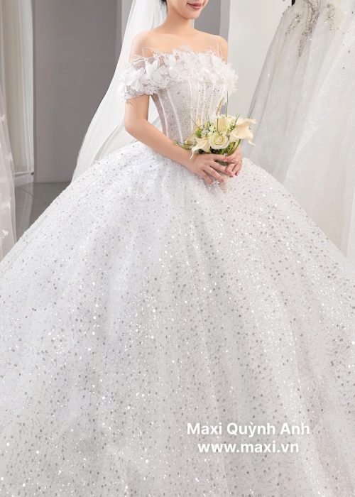 Toàn bộ váy được phủ một lớp kim tuyến hoặc hạt lấp lánh dày đặc, bắt sáng rất tốt, tạo hiệu ứng lấp lánh huyền ảo. Phần ngực và thân trên được trang trí bằng các chi tiết 3D màu trắng, có thể là hoa ren hoặc hạt cườm, đính kết tinh xảo. Thiết kế vai trễ, với lớp bèo nhún nhẹ nhàng, được đính các chi tiết hoa nhỏ li ti, tạo nét gợi cảm và nữ tính.