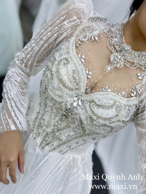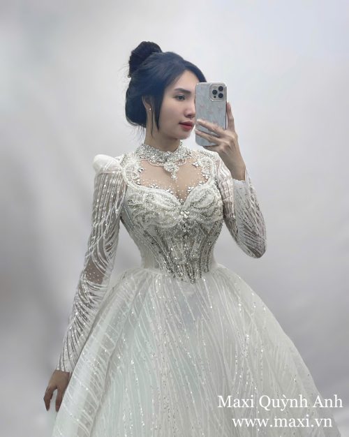 Hãy để bạn tỏa sáng như một nữ thần trong ngày trọng đại với thiết kế váy cưới đầy tinh tế và cuốn hút này. Chiếc váy là sự kết hợp hoàn hảo giữa vẻ đẹp cổ điển và nét hiện đại, được thiết kế để biến bạn thành tâm điểm của mọi ánh nhìn. Phần thân trên được đính kết hoàn toàn thủ công từ pha lê lấp lánh, tạo hiệu ứng ánh sáng tuyệt đẹp. Phom dáng xòe rộng và bồng bềnh mang lại vẻ lộng lẫy, kiêu sa. Đặc biệt, chi tiết cape voan mềm mại buông rủ từ vai tạo vẻ đẹp lãng mạn và bay bổng như một nàng tiên. Đây là lựa chọn lý tưởng cho những nàng dâu muốn có một vẻ ngoài thật nổi bật, quý phái trong ngày trọng đại.