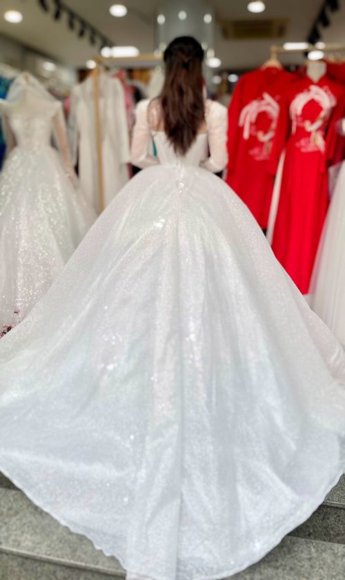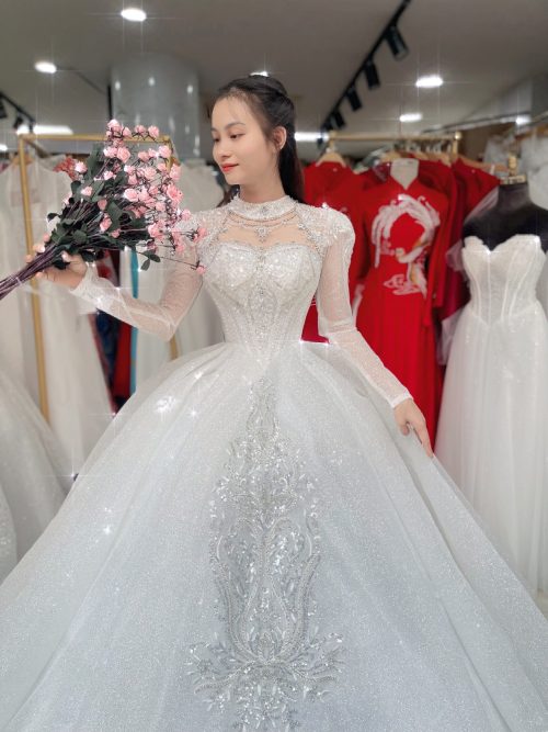 Váy Cưới Kim Sa Tay Dài Phối Vòng Cổ Cao Cấp