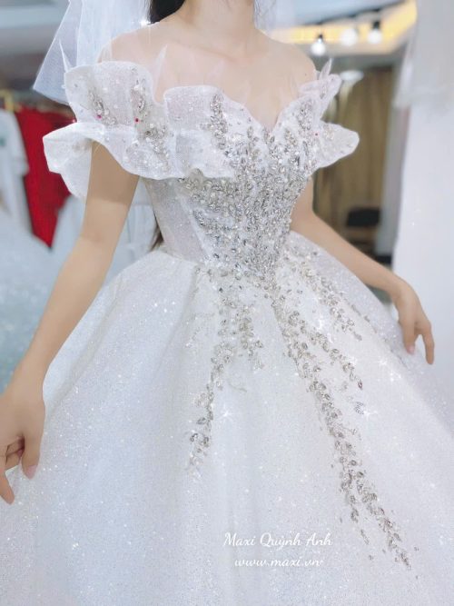 Điểm nhấn kiêu sa nằm ở phần vai trễ (Off-the-shoulder). Vai áo được tạo hình bằng những lớp vải xếp nhún/xếp nếp mềm mại, đính kết điểm xuyết đá quý và kim tuyến, tạo sự bay bổng, lãng mạn mà vẫn vô cùng sang trọng, làm nổi bật bờ vai thanh mảnh.