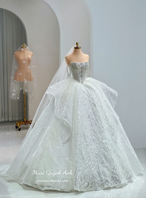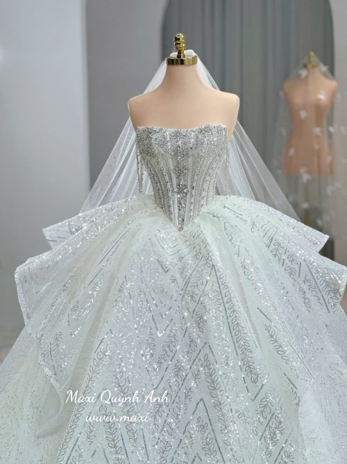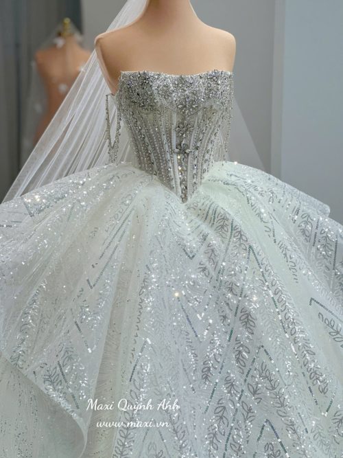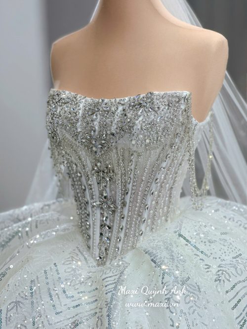 Váy Cưới Kim Sa Trễ Vai Ngọc Trai Cao Cấp