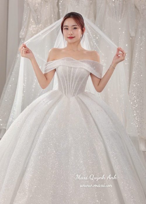 Váy Cưới Kim Sa Trễ Vai Nhấn Eo Cao Cấp