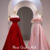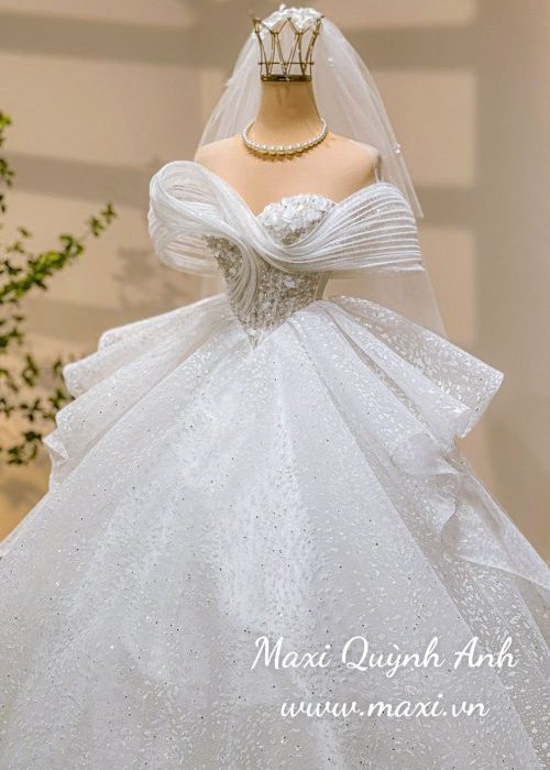 Điểm nhấn đặc biệt của chiếc váy là phần cổ trễ vai gợi cảm, khéo léo khoe bờ vai thon thả và xương quai xanh quyến rũ. Toàn bộ thân áo được phủ một lớp kim sa cao cấp, lấp lánh như những vì sao, tạo hiệu ứng ánh sáng tuyệt đẹp dưới mọi góc nhìn. Những hạt kim sa được đính kết tỉ mỉ, tạo nên những họa tiết tinh xảo, làm nổi bật sự sang trọng của trang phục. Chất liệu vải mềm mại, bay bổng ở phần chân váy càng làm tăng thêm sự lãng mạn và bay bổng cho cô dâu trong ngày trọng đại.
