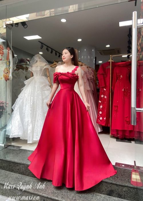 Váy Cưới Lệch Vai Hoa Đỏ Sang Trọng