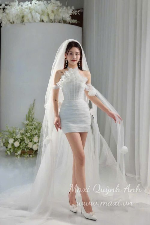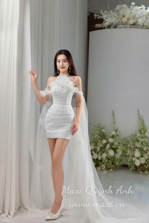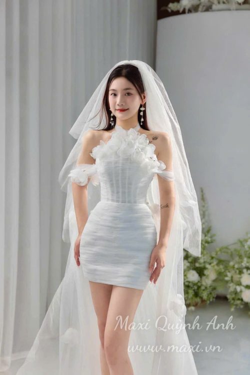 Váy Cưới Ngắn Cổ Yếm Phối Bèo