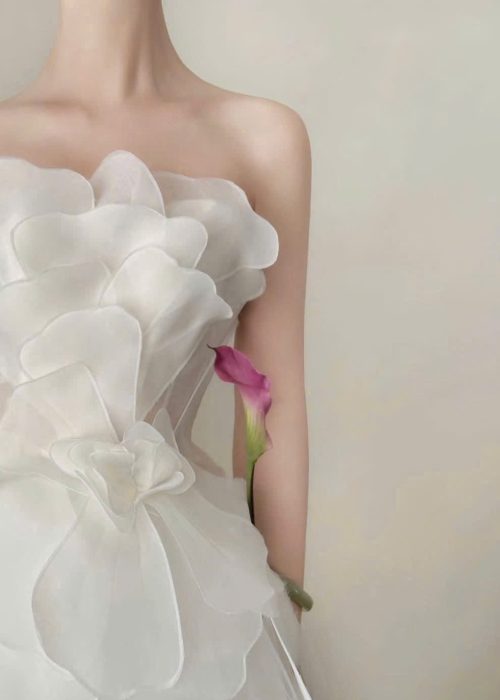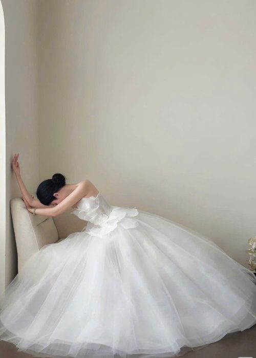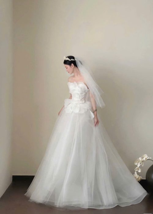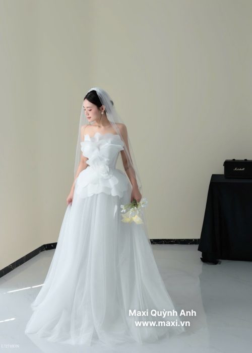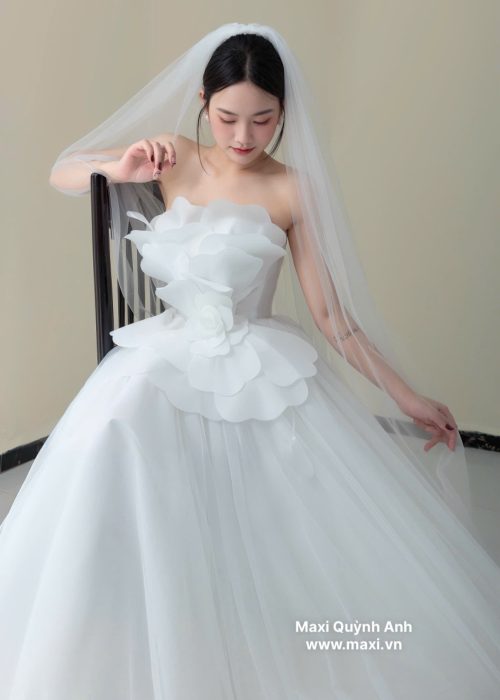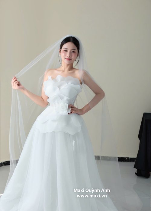 Váy cưới dáng xòe nhẹ cùng với tùng váy làm từ nhiều lớp vải voan mỏng, nhẹ nhàng, tạo độ bồng bềnh tự nhiên và bay bổng kèm với màu trắng tinh khôi, là màu sắc truyền thống của váy cưới. Tạo sự thanh thoát và thoải mái cho cô dâu khi di chuyển. Cổ áo với thiết kế cổ cúp ngực (strapless), khoe trọn bờ vai và xương quai xanh quyến rũ. Ngoài ra điểm nhấn đặc biệt của chiếc váy là phần ngực được tạo hình bằng những cánh hoa lớn, xếp chồng lên nhau một cách tinh xảo, tạo hiệu ứng 3D bồng bềnh và ấn tượng. Phần eo được chiết eo gọn gàng, có thêm một lớp vải viền tròn như những cánh hoa nhỏ xòe ra, nối liền với phần tùng váy, giúp tôn lên vòng eo thon gọn của cô dâu.