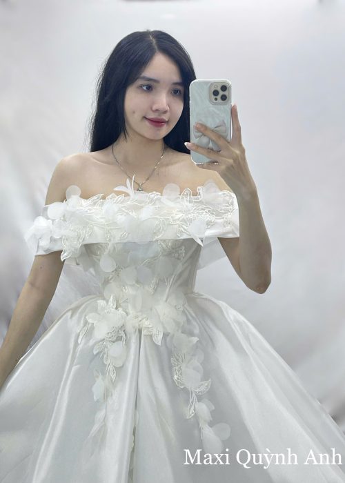 Maxi Quỳnh Anh tự hào giới thiệu mẫu váy cưới trắng tinh khôi, kiệt tác của sự thanh lịch và tinh tế. Chiếc váy này không chỉ là trang phục, mà còn là hiện thân của giấc mơ về một tình yêu vĩnh cửu.