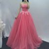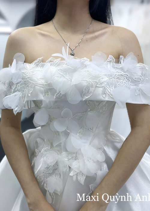 Phom dáng công chúa xòe bồng bềnh, với phần thân trên ôm sát eo, giúp tôn lên đường cong mềm mại của cô dâu. Điểm nhấn đặc sắc nhất của chiếc váy là những đóa hoa 3D mỏng manh, được đính kết thủ công một cách tỉ mỉ, trải dài từ phần ngực đến eo. Những cánh hoa như đang bung nở, tạo nên hiệu ứng thị giác sống động và lãng mạn. Phần vai trần gợi cảm được tô điểm bởi những cánh hoa nhỏ xinh, khéo léo khoe bờ vai thon thả, giúp cô dâu thêm phần quyến rũ.