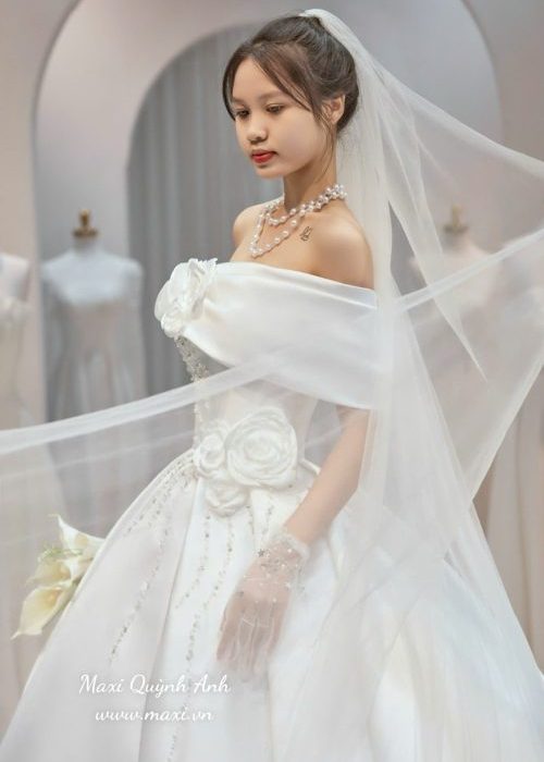 👰 Form dáng xòe phồng (ball gown) cực đại, tạo sự hoành tráng và lộng lẫy tuyệt đối. Điểm nhấn là thiết kế trễ vai xếp nếp tinh tế, khoe khéo bờ vai thon thả và xương quai xanh quyến rũ. Phần eo được đính kết họa tiết hạt cườm lấp lánh tạo điểm nhấn độc đáo và giúp tôn lên vòng eo con kiến.