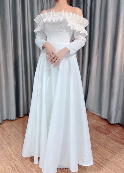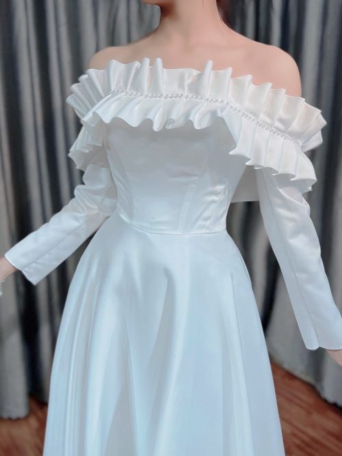 Chất liệu: Váy được may từ chất liệu satin cao cấp, có độ bóng nhẹ tự nhiên, mang đến sự sang trọng và mềm mại tuyệt đối. Chất liệu này không chỉ tạo nên form dáng hoàn hảo mà còn giúp cô dâu di chuyển thật uyển chuyển, thanh thoát.