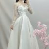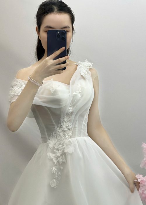 Chiếc váy cưới mang thiết kế trễ vai lệch duyên dáng, tạo điểm nhấn mới lạ và khoe trọn bờ vai thanh mảnh. Phần thân corset ôm sát giúp tôn vòng eo nhỏ gọn, kết hợp cùng họa tiết ren nổi chạy dọc eo mang lại sự mềm mại và tôn dáng. Lớp voan mỏng nhẹ phủ ngoài tạo hiệu ứng bồng bềnh, uyển chuyển trong từng bước di chuyển. Form váy xòe nhẹ kết hợp gam trắng tinh khôi giúp cô dâu vừa thanh lịch vừa ngọt ngào trong ngày trọng đại.