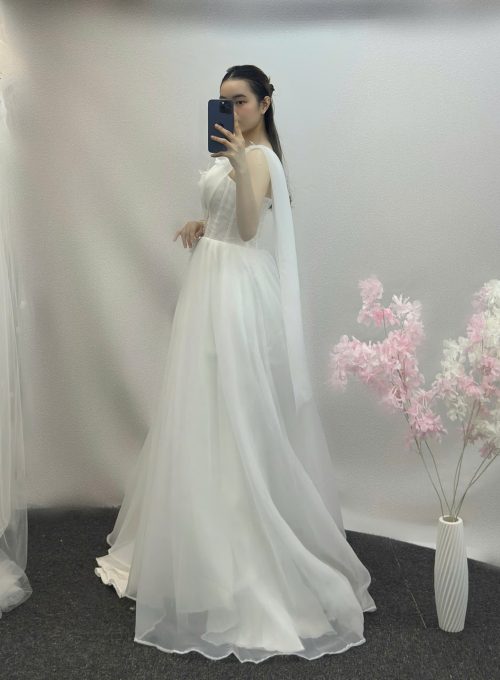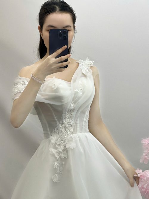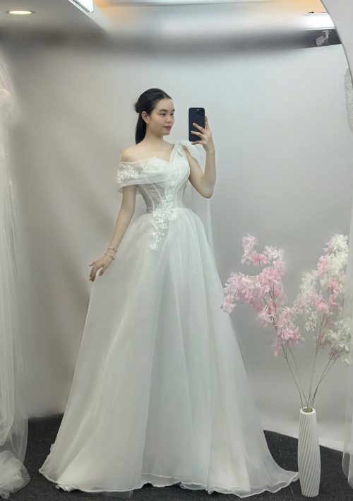 Chiếc váy cưới mang thiết kế trễ vai lệch duyên dáng, tạo điểm nhấn mới lạ và khoe trọn bờ vai thanh mảnh. Phần thân corset ôm sát giúp tôn vòng eo nhỏ gọn, kết hợp cùng họa tiết ren nổi chạy dọc eo mang lại sự mềm mại và tôn dáng. Lớp voan mỏng nhẹ phủ ngoài tạo hiệu ứng bồng bềnh, uyển chuyển trong từng bước di chuyển. Form váy xòe nhẹ kết hợp gam trắng tinh khôi giúp cô dâu vừa thanh lịch vừa ngọt ngào trong ngày trọng đại.