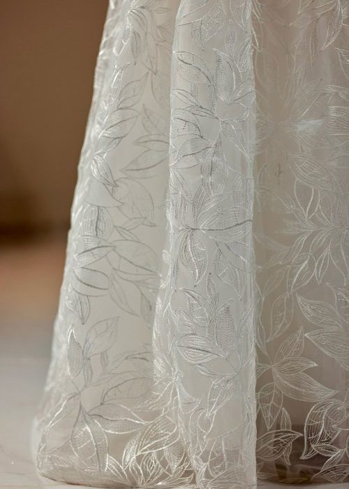 💖 Chất liệu voan lưới thêu họa tiết chìm tinh xảo, tạo nên vẻ đẹp bí ẩn và sang trọng. Toàn bộ phần thân áo được đính kết thủ công những đóa hoa 3D mềm mại, nhẹ nhàng từ cổ áo trải dài xuống eo và tà váy, tạo nên một khu vườn cổ tích đầy mộng mơ. Các chi tiết hoa 3D này không chỉ làm tăng thêm sự lãng mạn mà còn giúp chiếc váy trở nên sống động và có chiều sâu.